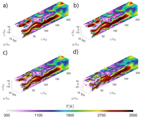 The fully resolved results can be filtered using different filter widths to obtain validation data for the subgrid models. This enables the measurement of the actual subgrid turbulent quantities. An output example for the filtering process can be visualized in Figure 5, where the filtered temperature field with different widths can be compared against the entirely resolved direct numerical simulation. A summary of the used filters is provided in Table 3. As can be seen, large filter widths over DNS fields produces an excessive pixelation. Such results are physically unrealistic and cannot be the outcome of a numerically sound LES. However, if a top-hat filter with an excessive width is applied over a well resolved field, such unnatural results are feasible. The inaccuracy of such filter widths will be further commented on in the results section.