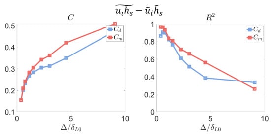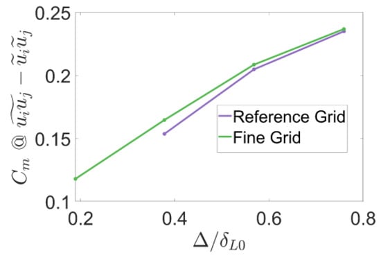 A finer grid has been used to perform a mesh sensitivity analysis over the entire procedure. The grid size of the refined mesh is half the one of the reference DNS. The obtained value for the coefficient in both the reference simulation and the refined one can be compared in Figure 9. Only the coefficients for the smaller filter sizes are displayed. since the results for larger filters are virtually indistinguishable. As can be seen, there is a minor error in the coefficient for the filter with . More specifically, the finer grid provides a value 6.1% larger compared to the reference case for the smallest filter width. This increase originates from the small amount of unresolved turbulent processes in the reference case. The discrepancy between the reference case and the one with a refined grid tends asymptotically to zero as larger filter widths are considered, illustrating that the amount of subgrid information contained in both simulations is virtually identical.