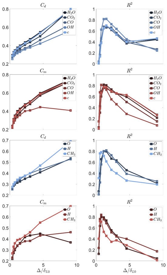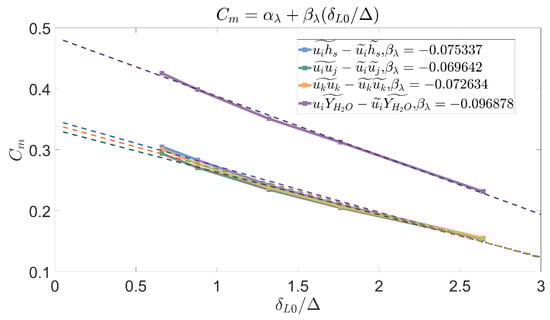 Besides the different sensitivities, it is evident that dispersion is greater for the cells in the non-premixed regimen. This trend is consistently observed for most of the modeled subgrid fluxes, indicating a worse model performance in the regions where combustion is driven by diffusion. This behavior is probably caused by the fact that microscale mixing plays a significant role in the subgrid dynamics when the flow is locally non-premixed. Since these processes are partially uncoupled with the filtered (i.e., larger scale) quantities, they incorporate additional noise, worsening the model performance. For the different used grid sizes, the model constants at both premixed and non-premixed conditions were fitted using the least squares method. The obtained coefficients and model performance are presented in Figure 7.