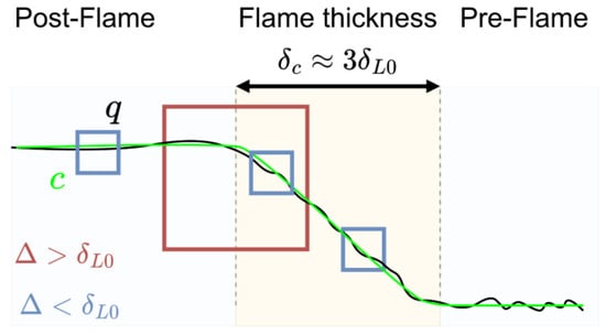 which is denoted as the Favre-filtered value of . There is a wide variety of filters that can be applied [,,]. In the frame of the present work, top-hat filters have been used because of their simplicity. These mathematical operators are explicitly defined as: