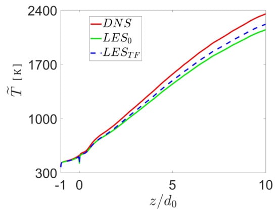 The main simulation aims at recreating mixing and combustion near the injection area and far away from the combustion chamber walls. A stationary diffusion flame is simulated in a cuboid domain with dimensions 0.2 × 0.2 × 1.2 mm and resolved with 192 × 192 × 1152 cubic cells with a constant geometry. This configuration corresponds to a grid spacing . This cell size ensures enough resolution for the smallest Kolmogorov eddies []. The used resolution was proved to ensure convergence of the turbulent statistics in a mesh sensitivity analysis with virtually identical setups [,]. This grid size provides a resolution of the stoichiometric premixed flame front, with roughly 5.3 cells. Nevertheless, in turbulent methane–oxygen diffusion flames the thinnest realized flamelets at least double this value, as evaluated in previous works [,]. Therefore, the effective flame front resolution is in the order of 10–20 cells. A resolution with a finer grid size ( and 384 × 384 × 2304 cells) was conducted to perform a mesh sensitivity analysis on the results, with marginal differences found, as presented in Section 4.2.1.