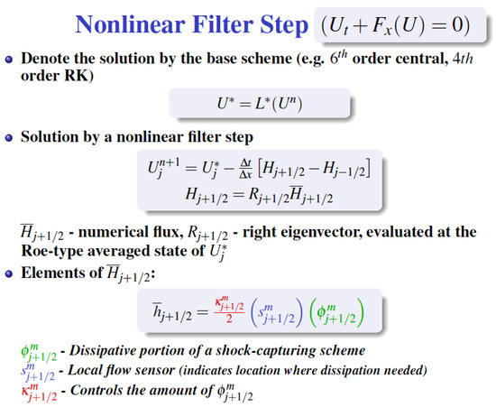 The nonlinear filter idea was first introduced and tested by Yee et al. [25,26] using an artificial compression method (ACM) by Harten [60] as the flow sensor. Later, smart flow sensors were developed by Sjögreen & Yee, Yee & Sjögreen, and Kotov et al. [14,15,17,27,28]. Unlike the hybrid approach, in the presence of physical viscosity, the primary high-order non-dissipative scheme includes the discretizations on both the inviscid and viscous portions of the governing equation before the nonlinear filtering post-processing step. This is opposed to the hybrid method. It examines the computed flow data from the previous time step information. In addition, switching between two methods that can create instability during frequent switching between two methods is opposed to the nonlinear filter methods that do not switch between methods. The high-order base scheme again can be a standard central, Padé, or DRP method, depending on the flow type in question.