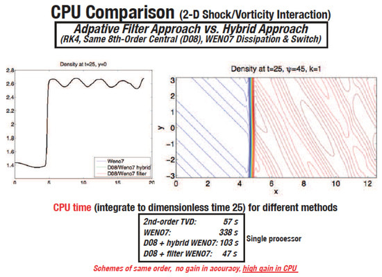Figure 5 shows the accuracy and CPU comparison between a hybrid method reported in [31] and a nonlinear filter method using the same non-dissipative high-order linear spatial discretization blending with the same shock-capturing method for a 2D shock–vorticity interaction. For this test problem illustrated here, we used the Ducros et al. flow sensor [79].