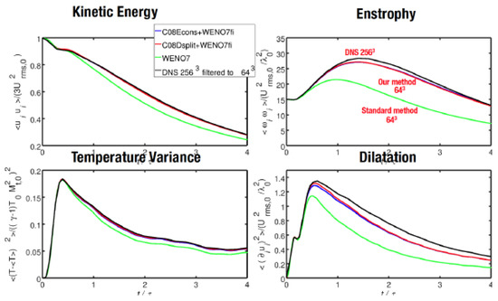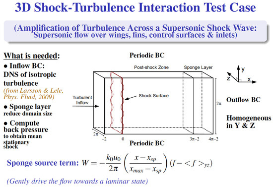 - Johnsen, E.; Larsson, J.; Bhagatwala, A.; Cabot, W.; Moin, P.; Olson, B.; Rawat, P.; Shankar, S.; Sjgreen, B.; Yee, H.; et al. Assessment of high-resolution methods for numerical simulations of compressible turbulence with shock waves. J. Comput. Phys. 2010, 229, 1213–1237. [Google Scholar] [CrossRef]