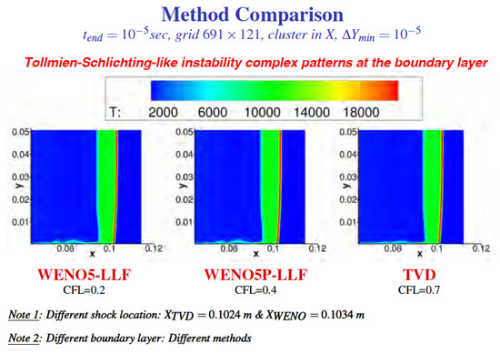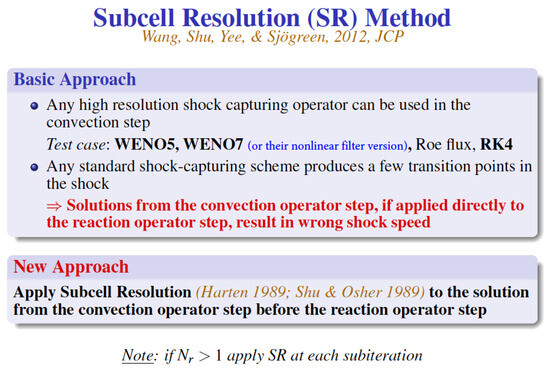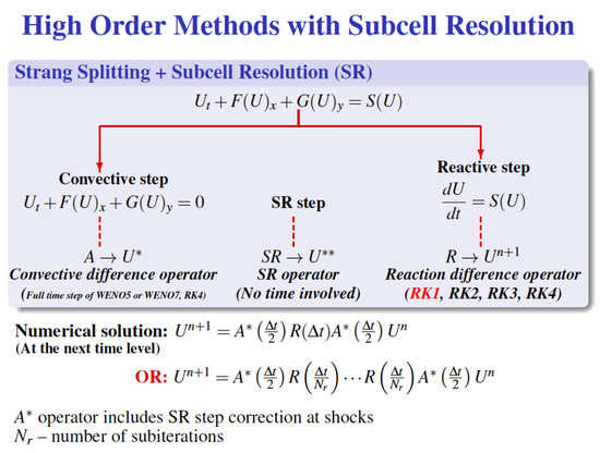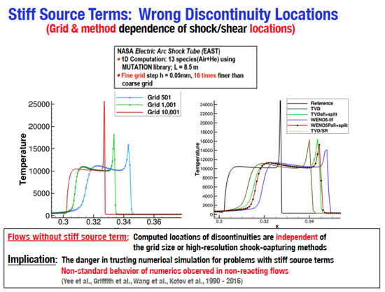 For combustion and reacting flows containing stiff source terms and discontinuities, it is a well-known phenomenon that a wrong propagation speed for discontinuities is obtained when conservative numerical methods that were developed for flows without source terms are used [1,2,3,4,5,6,7,8,9,10,11]. The construction of numerical methods for a stable and accurate simulation of turbulence with shear and shock (viscous shock) waves, and to obtain a correct propagation speed for discontinuities in the presence of stiff source terms, shares one important requirement—the minimization of numerical dissipation while maintaining numerical accuracy and stability. The dual requirements to achieve both numerical stability and minimal numerical dissipation are often conflicting since the majority of past and present shock-capturing methods were designed mainly to be robust in flows without turbulence and/or stiff source terms.