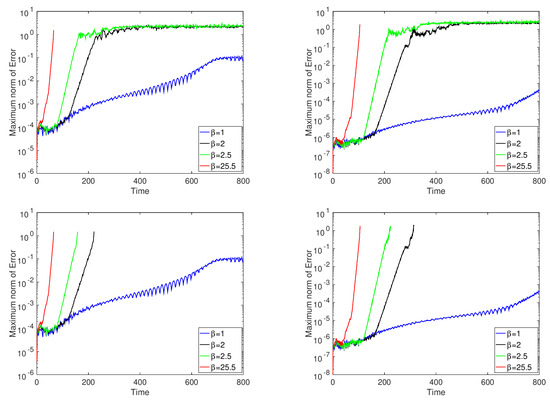 To show the performance between the eighth-order central Padé vs. eighth-order classical central discretizations, we illustrate the simulation of a well-known Alfen MHD test case. See [23,30] for details of the problem setup and the ideal MHD equations notation. Figure 1 shows the problem setup. Figure 2 shows the maximum error time evolution comparison. The comparison is between Padé vs. classical central and Padé vs. classical central with the entropy-splitting form of the inviscid flux derivative consisting of two different entropy split parameters, . “Ce” denotes the eighth-order central, and “Co” denotes the eighth-order Padé. “CeES” denotes the eighth-order central, and “CoES” denotes the eighth-order Padé on the entropy split form of the inviscid flux derivative. The four eighth-order classical central methods can prolong the accuracy much longer than the Padé method counterparts with or without the entropy-splitting form of the discretization [26]. The error stays small for the longest time for CeES at and for CoES at . The time discretization is the fourth-order classical Runge–Kutta method. Here, the “entropy splitting form of the inviscid flux derivative” denotes entropy-conserving discretization by employing non-dissipative central discretization in the entropy-splitting form of the inviscid flux derivative. See later sections for a discussion or our original work [19,20,22,23,26,76] for details. This method is denoted as the entropy split method in the later discussion and also in our recent publications.