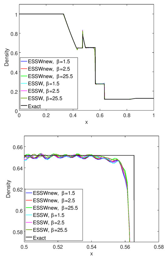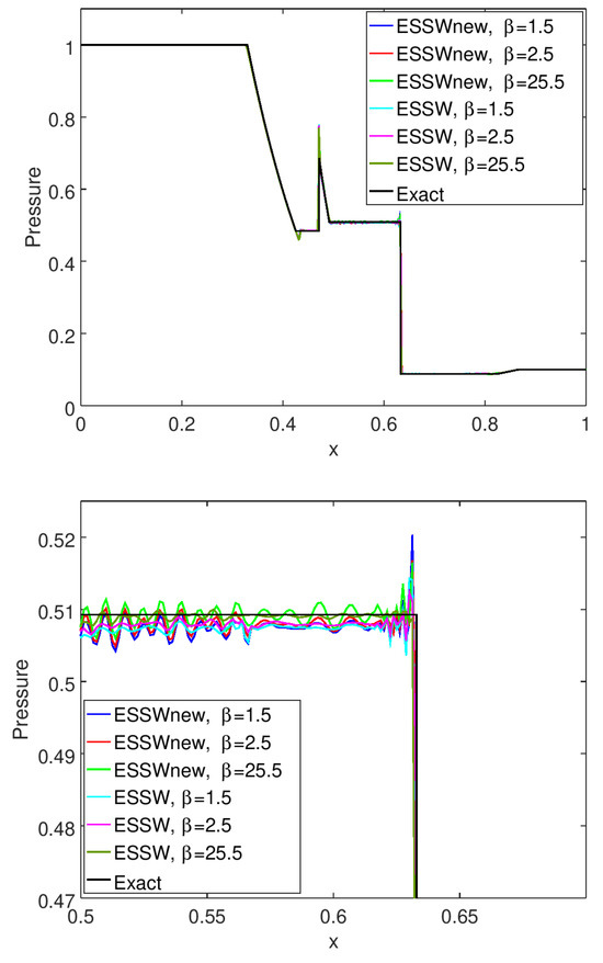 where is a high-order non-dissipative numerical flux, and is a high-order shock-capturing numerical flux. is a local flow sensor. For a 1D system of hyperbolic conservation laws using a complete set of characteristic waves, the high-order shock-capturing methods are preferred to locally discretize each of the characteristic waves using a complete set of Riemann solvers [24,25,26,37,38]. If a multidimensional method is not used, it is also very common to apply a 1D Riemann solver method, dimension by dimension, for a multi-dimensional system of hyperbolic conservation laws [14,15,17,24,27,28,37].