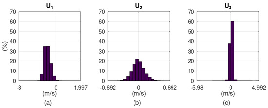 Figure 2 displays the histograms of the raw data collected with the Vectrino velocimeter. The range of the horizontal axes in these histograms indicates the minimum and maximum values observed. This range is plausible only for the shape of the histogram of .