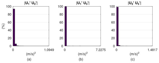 Histograms of obtained from the filtered measurements: (a) bin size 0.074 , (b) bin size 0.363 , (c) bin size 0.111 .