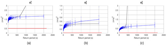 Return period plots of the square of the velocity components along XYZ axes: (a) , (b) , (c) ; with black line the return period of measurements; with red line the mean value of of the measurements; with marks in blue the 20 return periods of synthetic time series. The blue line represents the median of the 20 return period plots.