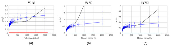 Return period plots of the product of the fluctuation of the velocity components: (a) , (b) , (c) ; with black line the return period of measurements; with red line the mean value of the measurements; with marks in blue the 20 return periods of synthetic time series. The blue line represents the median of the 20 return period plots.
