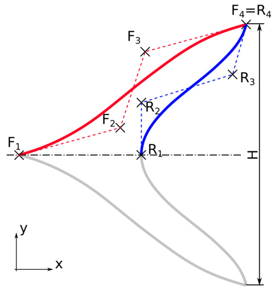 The design space is defined by 4 geometrical parameters, controlling the shape of the bluff body. For the front (red) Bézier curve, the tangents at the endpoints are set by moving the inner control points along circles centered at the endpoints (Figure 5-left). The ranges for the angle of the tangents are , . The tangent at the upper endpoint of the rear (blue) Bézier curve is varied similarly, . At its lower endpoint, the tangent remains vertical and the x-coordinate of the endpoint is changed, (Figure 5-right). The bluff body is symmetrical with respect to the x-axis.