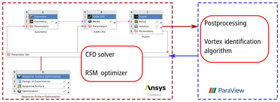 The optimization procedure involves connecting the individual tasks of geometry modification, mesh generation, flow solution, postprocessing and vortex identification into an interconnected automated loop, shown in Figure 4. The individual tasks are performed with a combination of commercial tools by ANSYS, Inc., Canonsburg, PA, USA, version 2022 R2 (geometry and mesh generation, flow solution, optimization), the open source postprocessing software ParaView and an in-house tool for vortex identification created by the authors. The whole procedure is driven by a Response Surface Optimization in the commercial DesignXplorer tool within the ANSYS Workbench environment and involves three steps: Design of Experiments (DOE), Response Surface and Optimization.