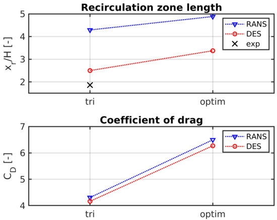 The RANS and DES computations differ quantitatively in the predicted recirculation zone length, but they are consistent in terms of the trends that occur with a geometry change. Figure 7-top shows that both models predict an enlargement of the recirculation zone for the optimized geometry. An excellent agreement between RANS and DES is achieved in terms of the predicted drag force acting on the bluff body (Figure 7-bottom). The RANS simulation predicts an increase of the drag force by 50.7% for the optimized geometry, which matches very closely the increase by 50.5% in the DES results. Moreover, the predictions are very close also in terms of absolute values, as the drag coefficient evaluations agree within 3.5% on both geometries.