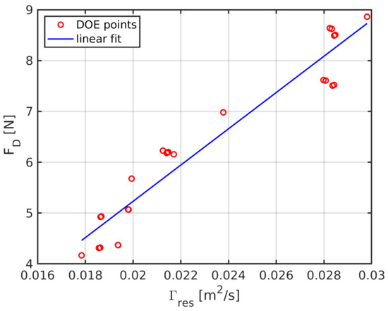 Drag as a function of vortex strength for the points generated during the design of experiments, together with a linear interpolation.