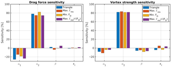 To analyze why a particular design was obtained for the given objective, the local sensitivities of drag force and vortex strength to the 4 input parameters were evaluated. The local sensitivity of an output parameter to an input parameter is calculated as a ratio of the maximum variation of achievable by changing only the parameter , to the maximum variation of with all input parameters: