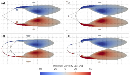 The inaccuracies of vortex detection with residual vorticity are attributed to the limitations of identifying a non-local flow pattern with a local method [16]. They are common to local vortex detection criteria, such as the popular Q-criterion plotted in Figure 9-bottom. If zero thresholds are selected, vortex boundaries identified by and by Q are identical in planar incompressible flows. In both cases, vortex boundary is defined by the condition that the planar strain-rate is equal to the planar vorticity magnitude [24]. Although the zero-threshold vortex boundaries are identical, residual vorticity is in several aspects superior to the Q-criterion. It is valid in compressible as well as incompressible flows, indicates the sense (and in 3D the axis) of the swirling motion and its magnitude has an illustrative physical meaning related to the angular speed of rigid body rotation [24,40].