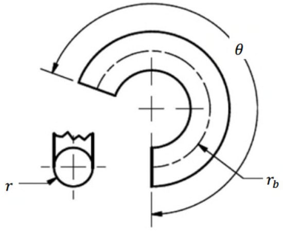 Geometry and nomenclature for a curved tube, showing the curved tube in plan view and also the cross-section. The radius of the cross-section is defined as , the bend radius as , and the bend angle as .