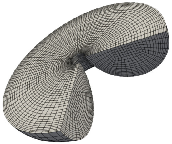 The tube was meshed with the grid, shown in Figure 3, for half of the pipe (symmetry along the central plane is exploited to reduce the solution size). Following a similar study by Fries [25,26,27], the pipe’s cross-section is divided into a central core with equal cell spacing, while the outer 2/3 of the radius is graded, with smaller cells toward the pipe walls to allow for better resolution of near-wall effects. In each cross-section, there are a total of 290 cells. This cross-section is then extruded in either a straight line of total length or revolved about an axis over an angle of (with a centerline length of ). The cells in the axial direction are spaced with a 1 mm spacing along the center line of the tube (approximately equal to the spacing in the radial and circumferential directions at the edge of the central core). OpenFOAM’s data structures are only concerned with the connections between cells, which permits the situation of which is physically impossible as the rotations would overlap in space, but allows for a longer length of tube and therefore more accurate solutions that minimize inlet effects. This can also be thought of as a helical coil in the limit as the helical pitch approaches zero. The baseline parameters for simulations are shown in Table 1.