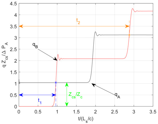 where is the fluid density, is the wave speed, and is the cross-sectional area of the tube (a subscript “s” is used to refer to quantities related to a reference straight tube in order to differentiate them from an arbitrarily curved tube under consideration). Note that this value is only related to the properties of the fluid and of the cross-section; there is no dependence on the length of the tube. This impedance would be measurable at the inlet of a tube of infinite length or at the inlet of a tube of finite length for the initial part of the response prior to the influence of returning reflected waves. This is shown in Figure 2 for a Method of Characteristics solution for the inlet flow, , in a straight tube of finite length subjected to a step in inlet pressure of . The ratio is equal to 1 in the middle portion (around ) of this plot for a lossless tube (small dissipation number . A similar method is used to measure the characteristic impedance of curved tubes, using response calculated using a CFD simulation.
