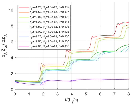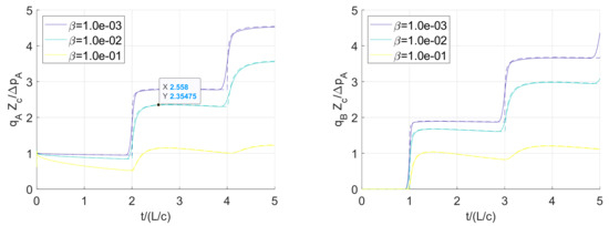 Finally, the linearity of the transient solution was verified by doubling the driving pressure step magnitude, . As shown in Figure 7 for curved tubes, the resulting flow doubles, but the shape is nearly exactly the same, with deviations only noticeable for extreme bend ratios and low dissipation numbers. This validates the linearity assumption and demonstrates that the solution does not rely on the Dean number (as it would for static solutions). The nonlinear static solution would be important for very large pressure waves, but the results presented here can be viewed as accurate for small variations about an operating point.
