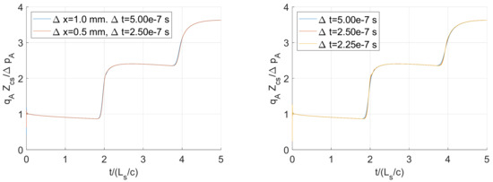 Mesh invariance test (left), showing little effect when the spatial mesh spacing is halved in each dimension while also halving the time step to maintain the same Courant number. (Right) the minimal effect of the Courant number is shown by reducing the time step (while maintaining a consistent spatial mesh).