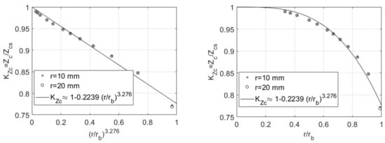 Characteristic impedance correction factor for a curved tube relative to a straight tube of the same dimensions and wave speed. The same data is plotted in each graph, with the exponent applied to the left plot’s x-axis to show linearity.