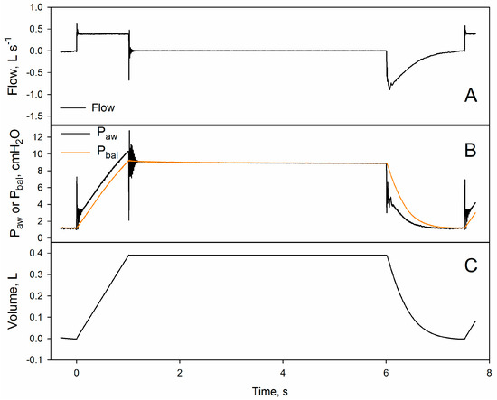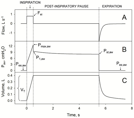 During the post-inspiratory pause, Paw slowly declines from P1,aw to Pst,aw (panel B, Figure 1). In line of principle, the slow Paw decay during the post-inspiratory pause may reflect two different phenomena: on one hand pendelluft, that is pressure equilibration between units with different time-constants, and on the other stress–relaxation, deriving from the viscoelastic properties of lung and chest-wall tissues. In healthy animals, the contribution of pendelluft to Paw decay is negligible [13,14], and P1,aw − Pst,aw is thought to reflect the viscoelastic properties of lung and chest wall tissues. Stress–relaxation can be quantified in terms of additional resistance (ΔR):