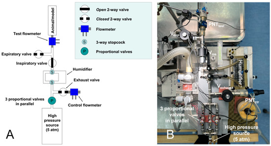 The figure shows a schematic drawing (panel A) and a photograph (panel B) of the ventilator. The 2-way valves are shown in the unpowered state. PNTtest, test pneumotachometer; PNTctr, control pneumotachometer. For a detailed description, see the text.