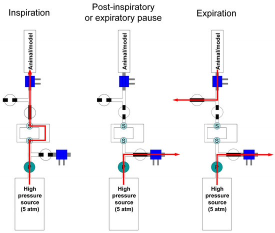 During expiration, the inspiratory valve is closed and the exhaust and expiratory valves are open, allowing air to flow from the animal to the expiratory port of the ventilator. Feedforward and feedback regulation of proportional valves take place similarly as in the post-inspiratory or expiratory pause.