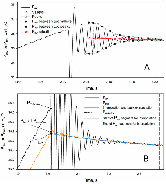 (Panel A) illustrates the procedure to eliminate part of the oscillations from Paw recordings. (Panel B) shows the interpolation and back-extrapolation procedure. The vertical dotted line shows the time at which Pmax,aw occurs. The two vertical broken lines delimit the segment which has been interpolated with a second order polynomial. This function has been back-extrapolated and its value at the time of Pmax,aw is P1,aw. The simultaneous value of Pbal (Pbal at Pmax,aw) is considered the reference against which P1,aw is compared when calculating ΔR, as, in the absence of any resistive behavior of the balloon and of leakage during the closure of the inspiratory valve, Pbal at Pmax,aw and P1,aw should be the same.