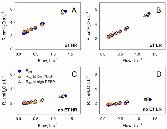 Reference resistance (Rref) (blue circles) and interrupter resistance (Rint) (triangles) measured with and without the endotracheal tube inserted in the circuit (ET, (panels A and B); and no ET, (panels C and D), respectively), in the presence of the higher or lower resistance (HR, (panels A and C); and LR, (panels B and D), respectively). Measurements were performed at low (1 cmH2O) (yellow triangles) and high (15 cmH2O) PEEP (orange triangles). For Rref, results at different PEEP levels were pooled.