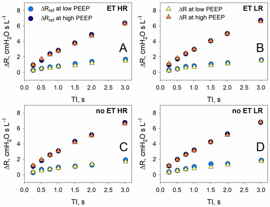 Reference additional resistance (ΔRref) (circles) and measured additional resistance (ΔR) (triangles) assessed with and without the endotracheal tube inserted in the circuit (ET, (panels A and B); and no ET, (panels C and D), respectively), in the presence of the higher (HR) or lower (LR) resistance. Measurements were performed at low (1 cmH2O) and high (15 cmH2O) PEEP.