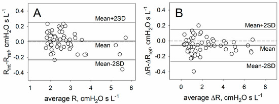 Measured Rint and ΔR closely followed their respective reference values in all conditions (Figure 7 and Figure 8). In all instances, a significant difference of Rint between HR and LR was detected (P < 0.020). The agreement between reference and measured values are shown in the Bland–Altman plots in Figure 9.