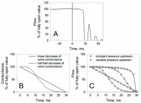 Panel A of Figure 10 shows the flow recorded during closing of the isolated inspiratory valve when the pressures upstream and downstream were 20 and 0 cmH2O, respectively. The delay between the generation of the closing signal (time 0, vertical line) and the complete closure of the valve was rather long (~28 ms), also relative to that of the other valves (11–12 ms). Apparently, flow did not decrease linearly with time immediately after the closing command, but rather remained almost constant or slightly decreased until a sudden fall to zero. Panel B of Figure 10 shows two hypothetical time-conductance relations, one linear and one half-bell shaped [29]: the corresponding flows (when upstream pressure is constant) are indicated by the circles of Panel C of the same figure. It is clear that the shape of flow shown by panel A is not compatible with a more or less gradual decrease in conductance starting from time 0, and this suggests that either the valve started to close some ms after the closing command or the initial change of conductance was modest. In addition, when the valve is mounted in the ventilator, the pressure upstream is not constant, and the changes in flow before complete closure tend to be minimized. Indeed, as the flow is proportional to the inverse of the sum of all the resistances in series (the high resistance offered by the three proportional valves plus the lower one offered by the inspiratory valve, see Equation (5)), during closure the pressure upstream to the inspiratory valve increases, limiting the decrease in inspiratory flow until the resistance offered by the inspiratory valve is very high (compare circles and squares in panel C of Figure 10).