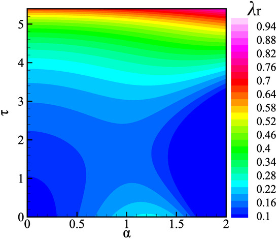 The contour plot in Figure 2 illustrates the variation in the first-order real growth rate with respect to the base-state time . It can be observed that the effective growth rate exhibits a saddle shape. As time progresses, the system experiences a sharp increase in growth rate, causing it to become highly unstable. This is attributed to the significant reduction in the liquid film thickness resulting from film evaporation within a limited time. The stability study following film rupture will not be further detailed since it has no practical relevance. In the subsequent analysis, we examine the scenario at the base-state time , i.e., .