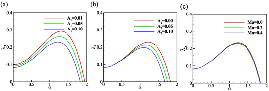 The real growth rate versus the wavenumber for (a) , ; (b) , ; (c) , . The other parameters are .