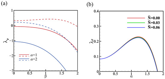 We first start the analysis by ignoring the spanwise influence, i.e., . The impact of parameter , which represents the distance of the system from thermodynamic equilibrium, is demonstrated in Figure 3a. It can be inferred that parameter plays a crucial role in determining the stability of the liquid film, where the real growth rate decreases as increases. Another important stability parameter, effective pressure , is depicted in Figure 3b. Both the growth rate and the critical wave number decrease with the increasing effective pressure, which is consistent with the analytical findings in Equation (68). However, at small wave numbers (i.e., ), stability is barely affected by effective pressure , since is proportional to the wave number in Equation (68). Extensive research has been conducted in previous studies regarding the Marangoni effect [32]. As shown in Figure 3c, it can be observed that within the given range of values, the destabilizing impact of the Marangoni effect is minimal. Thus, we will proceed with setting for the forthcoming studies.