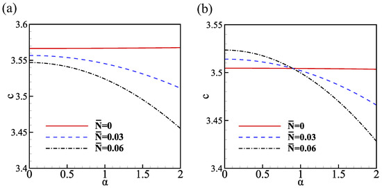In the present work, surface energy transport has a negligible effect on stability, as shown in Figure 4b, as the parameter exists in the first-order part of the effective growth rate . However, the influence of energy transport on wave speed cannot be discounted, and Figure 5 provides insight into this effect. For an evaporating film , an increment in energy transport leads to an increase in wave speed, as shown in Figure 5a. In the case of a condensing film, rises when the wave speed increases at a small wave number, while it decreases at a large wave number, with the critical wave number being . These results suggest that surface energy transport may not have a significant impact on the stability of the film, but it can affect the wave speed and, hence, the dynamics of the system. Thus, it is important to consider these factors when studying the behavior of evaporating or condensing films.
