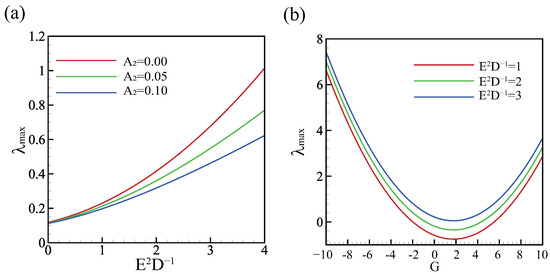 Figure 6 illustrates the destabilizing effects of vapor recoil and gravity on the system. Note that when , it represents an inverted liquid film. As observed in Figure 6a, increasing the vapor recoil effect can result in a higher maximum growth rate, whereas this instability can be mitigated by increasing the effective pressure coefficient . Moreover, the maximum real growth rate is relatively small under microgravity conditions. When the gravity increases, the maximum effective growth rate also increases. Under the same conditions, the inverted liquid film appears to be more unstable, as demonstrated by Figure 6b. It is noteworthy that a larger vapor recoil term leads to a larger maximum growth rate, indicating its destabilizing effect on the system. These findings show that both vapor recoil and gravity are critical factors affecting the stability of the system.