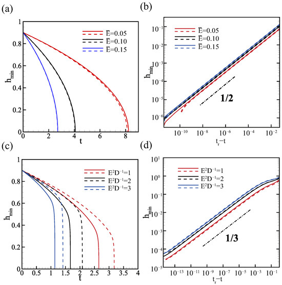 This indicates that the film will break down within a finite time, and the minimum thickness will thin as . The contribution under evaporation has a higher order, , than that under the vapor recoil effect, which gives . This implies that the scaling governing the breakdown process is not affected by the vapor recoil effect, and it is in line with the conclusion obtained by Wei and Duan [45].