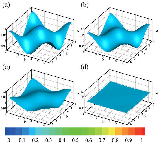 where are the time-dependent Fourier coefficients. and are the wave numbers in the x and y directions, respectively, where and are the lengths of the computational domain in the x and y directions. We chose the number of Fourier modes in the x direction to be and those in the y direction to be . Thus, there exist a total of Fourier modes, which is sufficient to ensure numerical accuracy.