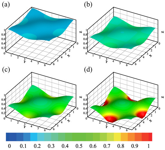 The evolution of the evaporation film () at different times. The depth of the color represents the magnitude of the temperature. The parameters are , A1 = 0.1, A2 = 0, . The consecutive snapshots correspond to (a) t = 0.97 s, (b) t = 4.00 s, (c) t = 5.01 s, (d) t = 5.40 s. The minimum and maximum of the interface are , respectively.