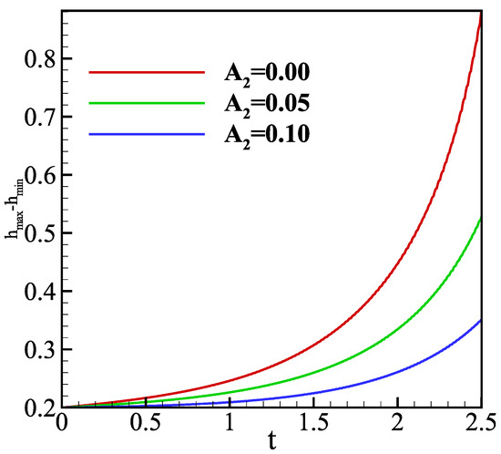 It should be noted that is a parameter that is used to define the base state of the system, which can change with time. The value of is usually chosen to be a specific value, while the value of t changes continuously as times progresses, and it is used to track the evolution of perturbation over time. Furthermore, Equation (67) demonstrates that an evaporating film will desiccate within a definite time frame of .