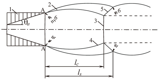 Figure 1 depicts the structure of the gas-dynamic section of a jet outflow from a conical nozzle (1). The barrel-shaped structure in the early area faces the surroundings in a convex manner. The mixing layer (2), center shock wave (3) (Mach disk), barrel (4), reflected shock waves (5), and expansion fans (6) are the key components of the jet in this region. The position of the Mach disk in the free supersonic jet, , and length of the first barrel, , are also depicted in the image. Typical for the degree of non-design is a jet diamond shock wave structure. In the gas-dynamic zone, many barrels of jet can exist for ; dangling shocks are reflected regularly off the jet centerline without a Mach disk forming.