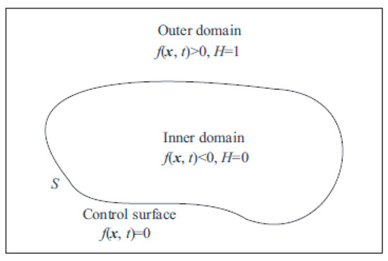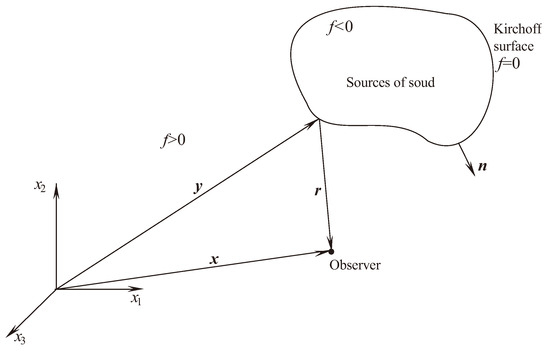 The flow of compressible viscous air in an unbounded region with solid boundaries is considered. An inhomogeneous wave equation is created by transforming the Navier–Stokes equations in methods based on the Lighthill acoustic analogy. A control surface (Figure 2) is introduced, encompassing all solid entities in the computational domain at each time moment, to derive the Lighthill wave equation characterizing the sound field. The function-indicator f is defined, where is the outside surface, is the inside surface, and on the Kirchhoff surface surrounding the noise sources.