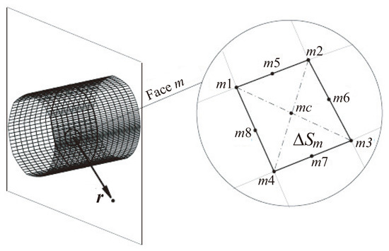 The control surface S is divided into M faces. The integrand at each face center is computed in discrete form at time . This integrand is defined by the radius vector . The form of the relation (7) is
