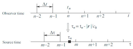 The partial derivatives are converted in partial derivatives . Quadrupole noise sources are disregarded, presuming that the control surface is sufficiently large to cover volumetric sources, to derive the wave Equation (2), which is convenient for numerical calculations. Farassat’s formulation I [35] is the integral form of the FW–H equation. It is written for acoustic pressure and has the form