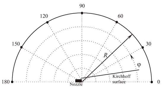 The acoustic analogy method is used to compute sound pressure. In order to achieve this, a certain surface that surrounds the jet from the outside is assigned. It is from this surface that the pressure, density and velocity values are obtained for computation. A unique procedure that computes the integral FW–H then processes these data. In the range of polar angles 22–163°, the noise level is measured at sites situated at a distance of from the nozzle outlet, where is diameter of nozzle outlet.