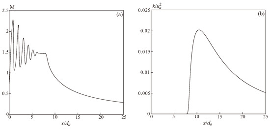 In the case when the speed of vortex transfer (convective speed) exceeds the speed of sound in the surroundings, Mach waves are emitted, the theory of which is developed in [25,26]. Large coherent turbulent structures simulate sine waves of instability with a wavelength equal to the distance between two successive eddies. They move with convective speed . In the surroundings, the speed of sound remains constant and equals . If , Mach waves are emitted at an angle . The peak of the Strouhal number, with which Mach waves are emitted, corresponds to the strongest instability wave [27]. The impact of non-isothermal flow on the emission of Mach waves is discussed in [28].